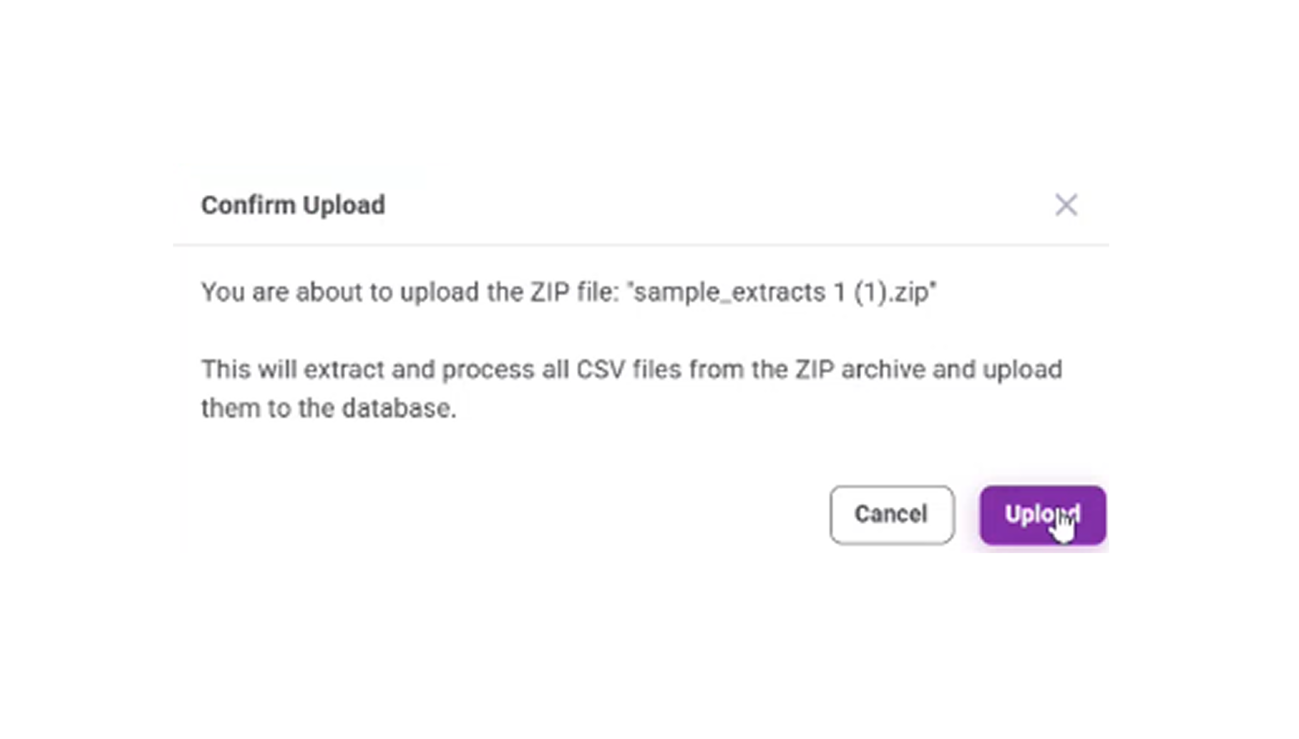 The ADMS upload feature allows users to import network data into the system by uploading a ZIP file containing multiple CSV files.