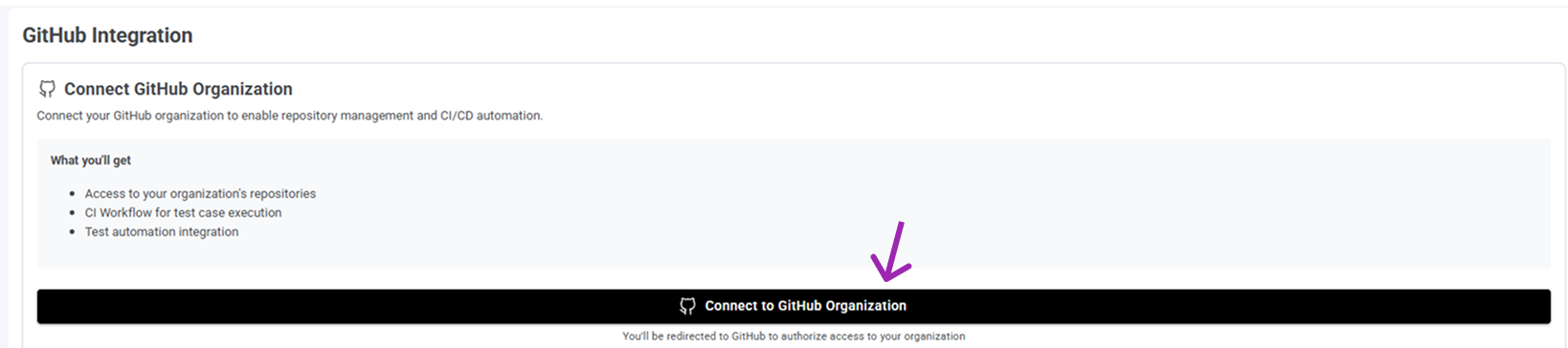 In the GitHub Integration section, click Connect to GitHub Organization under GitHub Organization.