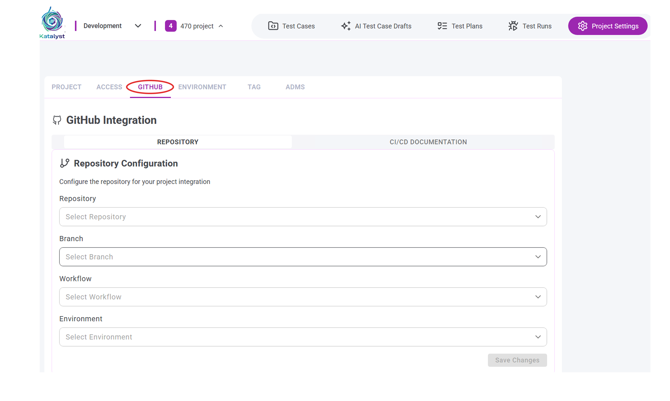 Once connected, users can select repositories, branches, and workflows, and configure CI/CD execution seamlessly.